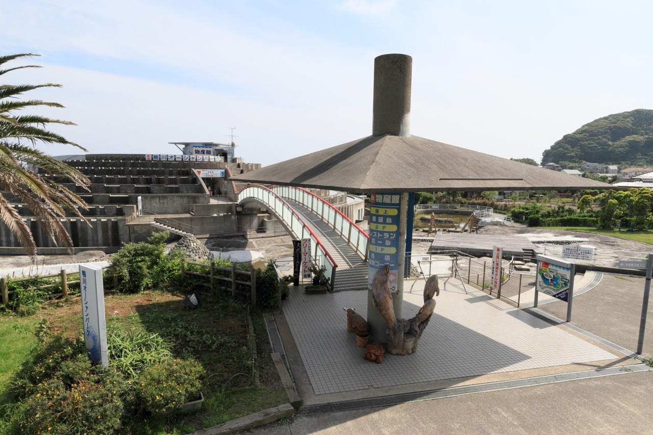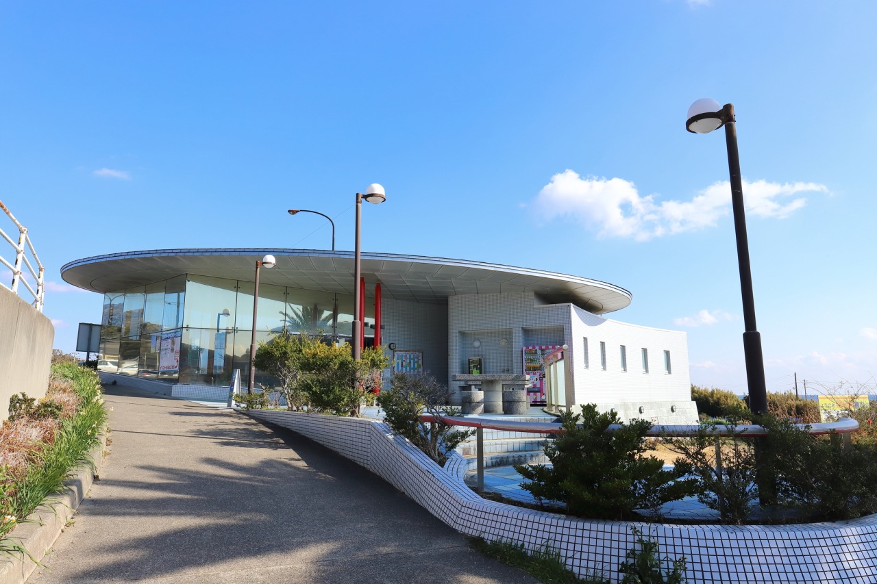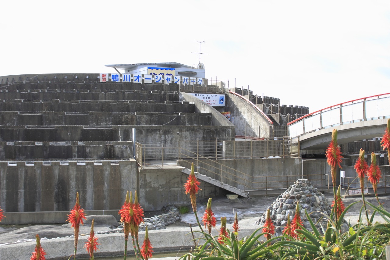獨特的外觀好像海螺或金字塔,是結合購物、美食與自然體驗的複合式休憩設施。一樓的物產館販售海鮮、鮮採蔬菜及鴨川名產點心等在地特產;二樓的海景餐廳則可品嚐使用漁港直送海鮮製作的招牌丼飯等美味料理;三樓設有可一覽太平洋壯麗景色的展望露臺。建築周圍設有重現昔日潮間帶生態的人工潮池千年磯,可盡情享受親水樂趣。此外,鄰近的漁民公園內設有利用鴨川溫泉泉水打造的免費足湯,讓遊客在海風與溫泉的療癒中消除旅途疲勞。園區旁的農園也提供花卉採摘與夏季蔬菜收穫等體驗活動,可感受鴨川的自然風光與地方魅力。(※體驗活動可能因作物生長狀況而異,詳情請參閱官方網站。)