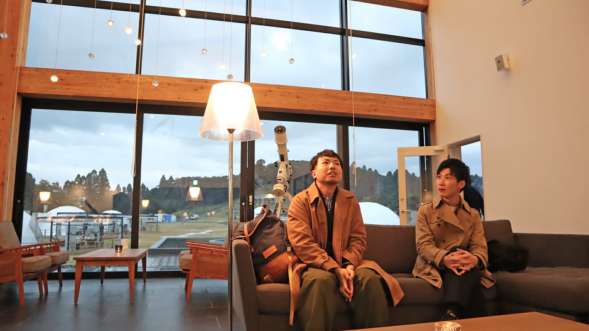 從大廳的落地窗就能看見豪華露營區的設施,連坐在裡面的沙發等待入住,都感到滿滿的異世界感。