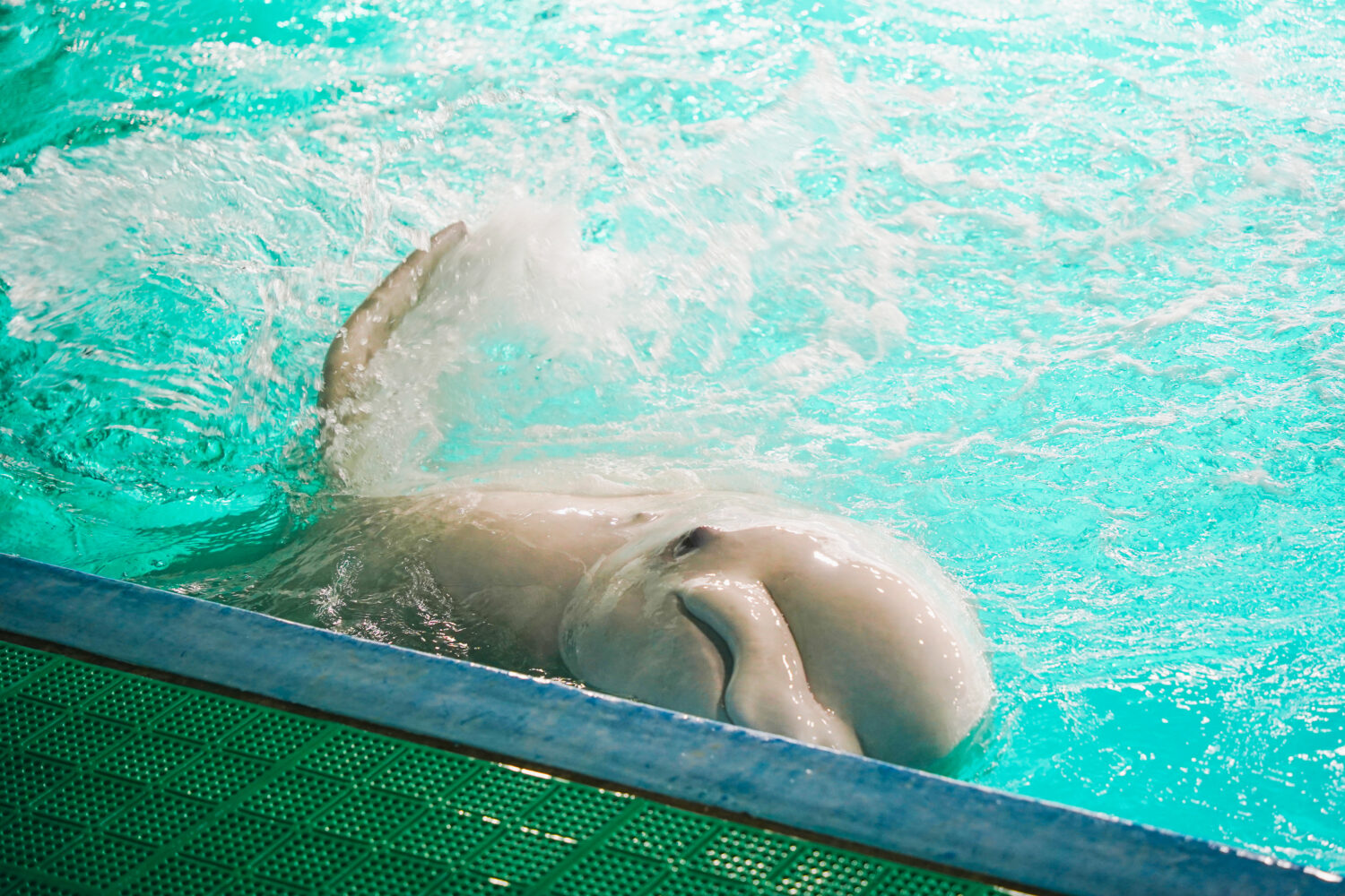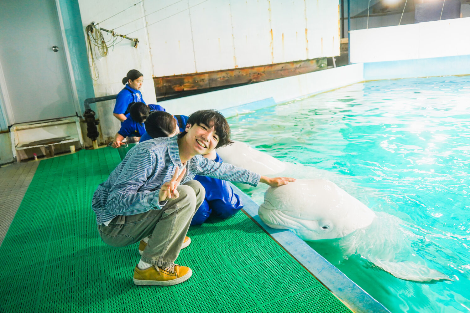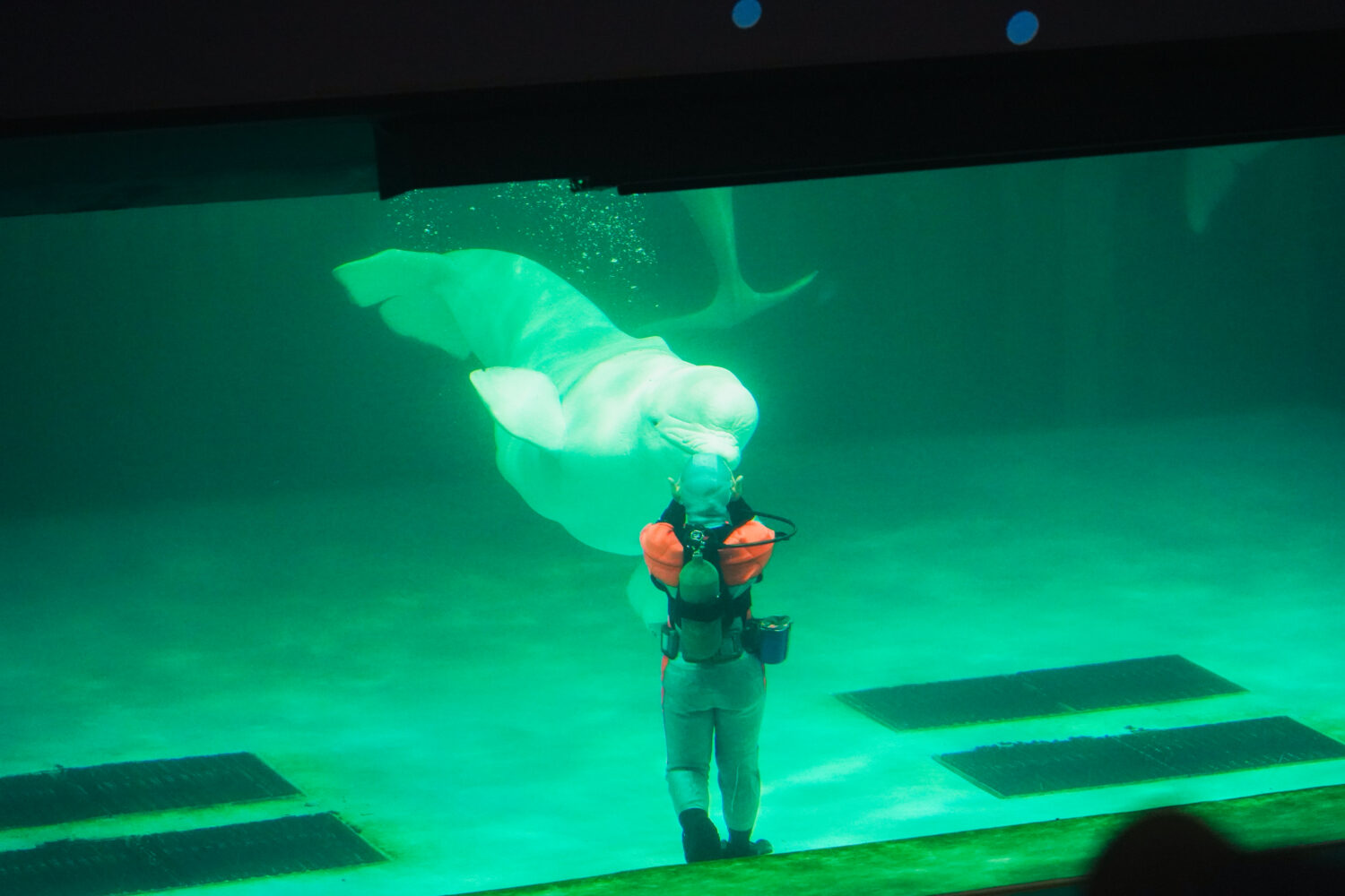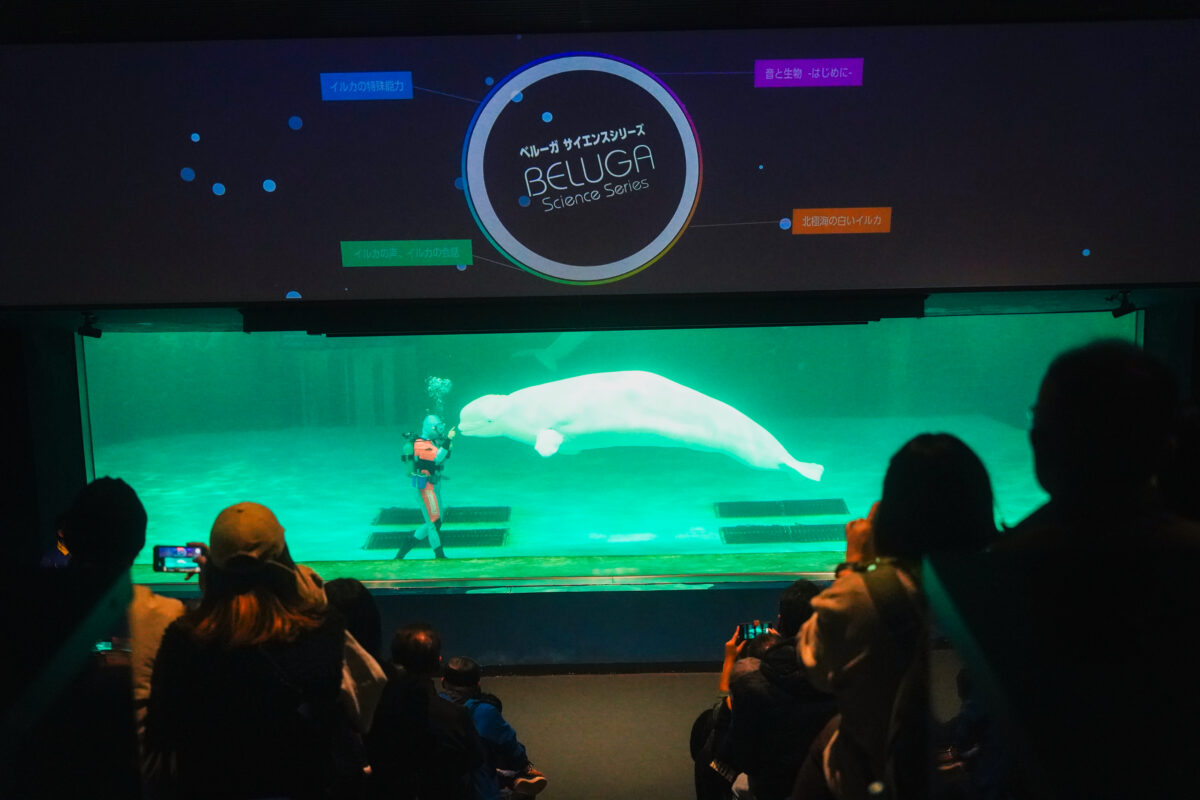 鴨川海洋世界的另一個人氣動物白鯨,每天會有幾場在室內劇場的表演,過程中除了能看到白鯨與飼育員的可愛互動之外,還會架設海底麥克風,讓白鯨親自為現場觀眾展現「海中金絲雀」的美妙叫聲。
