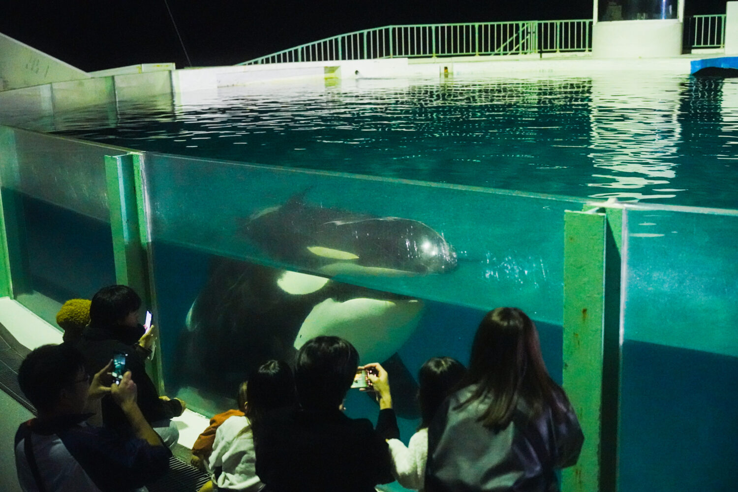 行程中會有飼育員的導覽介紹,並帶大家去觀察園內一部分的海洋動物,窺探海洋動物們的夜生活。其中最有人氣的仍然是虎鯨,入夜後也元氣滿滿的跟粉絲打招呼拍照呢!
