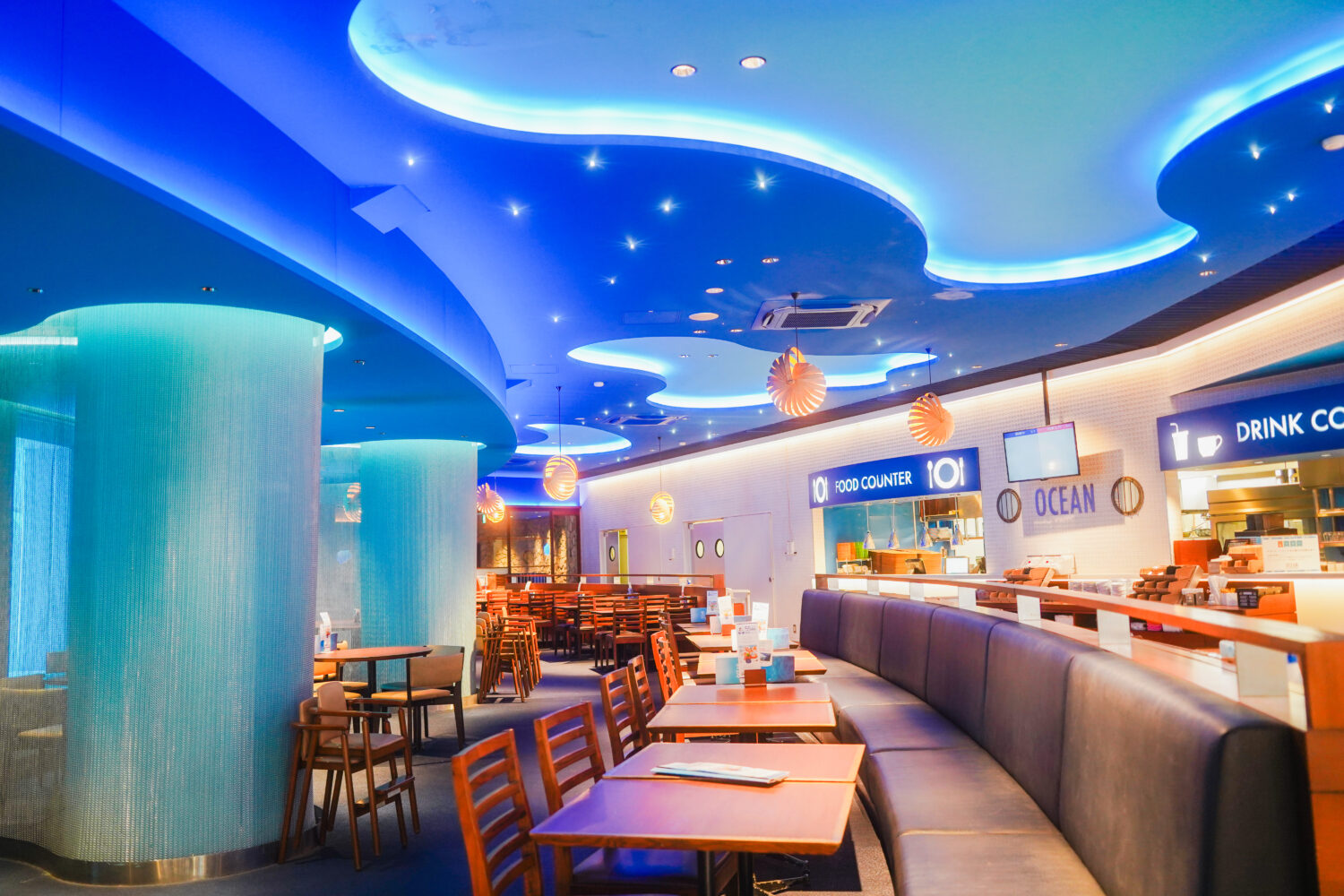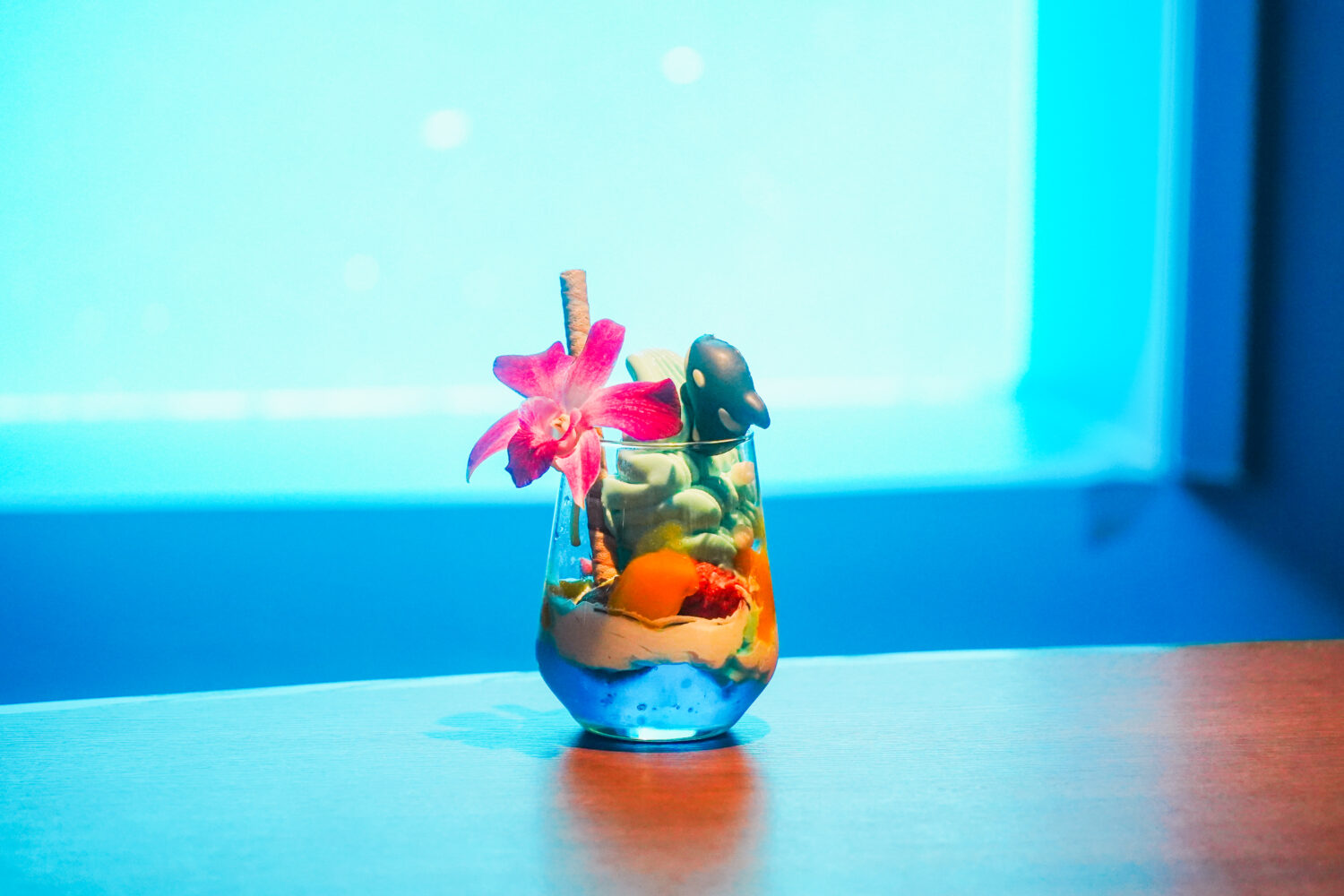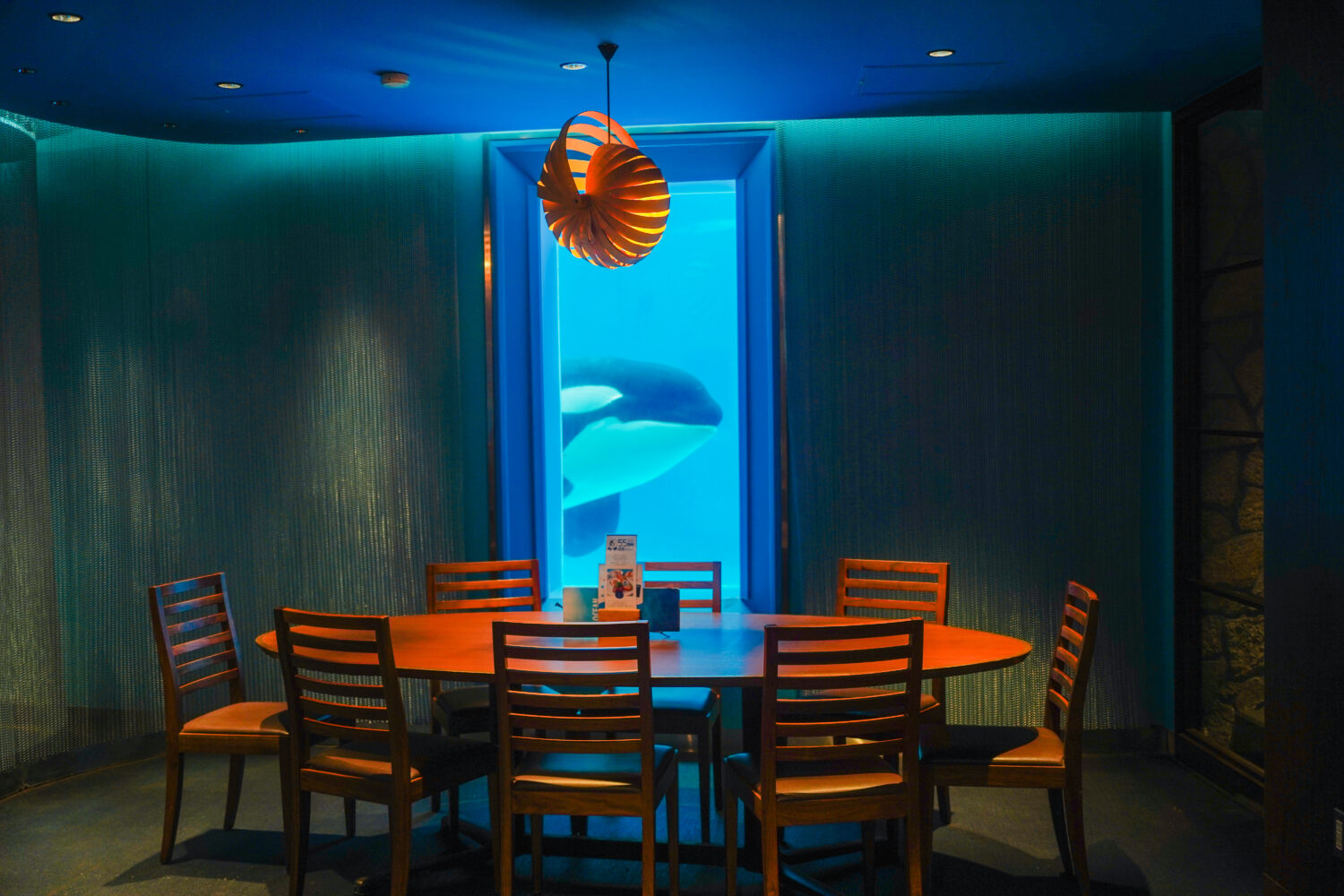 鴨川海洋世界裡有多家不同的餐廳可選擇,其中人氣最旺的莫過於能邊看著虎鯨邊用餐的海洋餐廳「Ocean」,彷彿置身海底用餐的沉浸式體驗!這裡從虎鯨造型的可愛餐點,到嚴選千葉縣當地食材的豪華料理都有,菜單可說是相當豐富多樣。