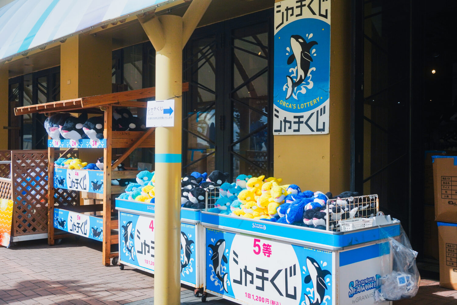 園區的伴手禮店有兩個地方,一個是在大門口,另一個是在園內的中央,也是規模最大的,這裡還有虎鯨娃娃的摸彩活動,手氣好的話,說不定還能把最大的虎鯨帶回家呢!