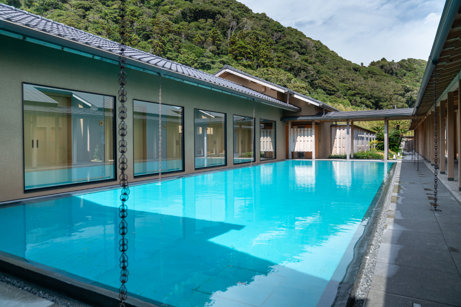 For over a decade, Futomi Elementary School had sat empty, evidence of Japan’s declining rural population. Where children once rushed through the entranceway, there was silence. Kunesaki-san approached the mayor saying he would transform it into something extraordinary. Permission was granted, and demolition began. The school building and the gym were demolished, but the pool remains as a centerpiece of the property’s stunning water features.