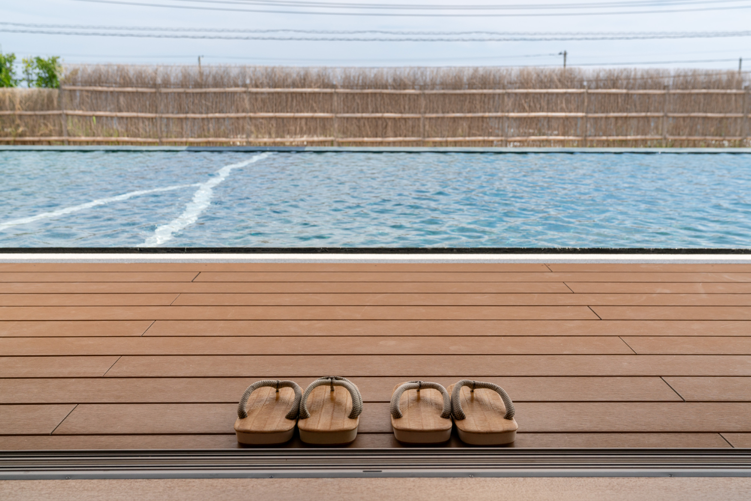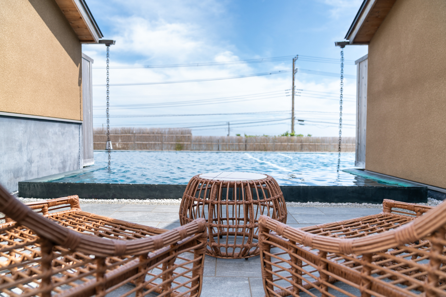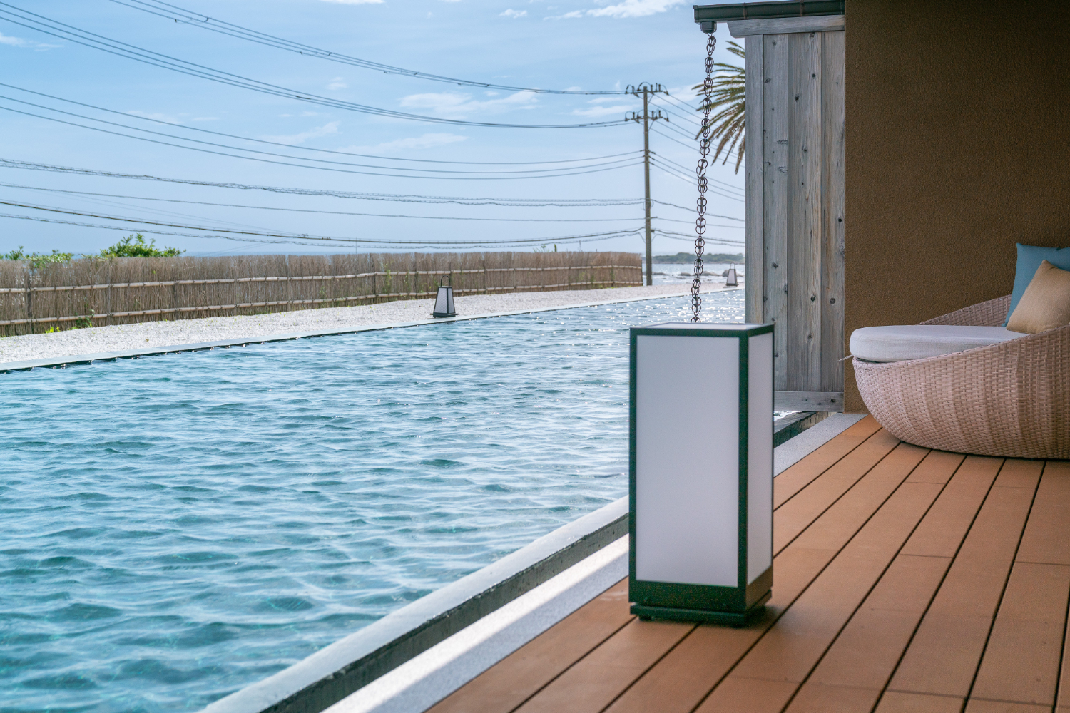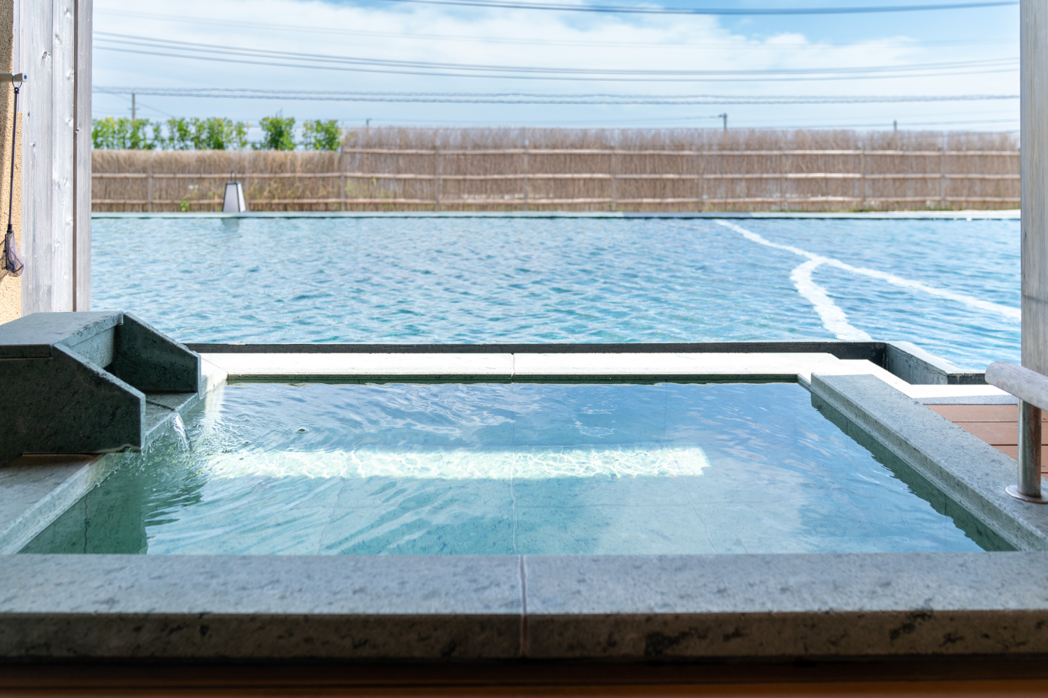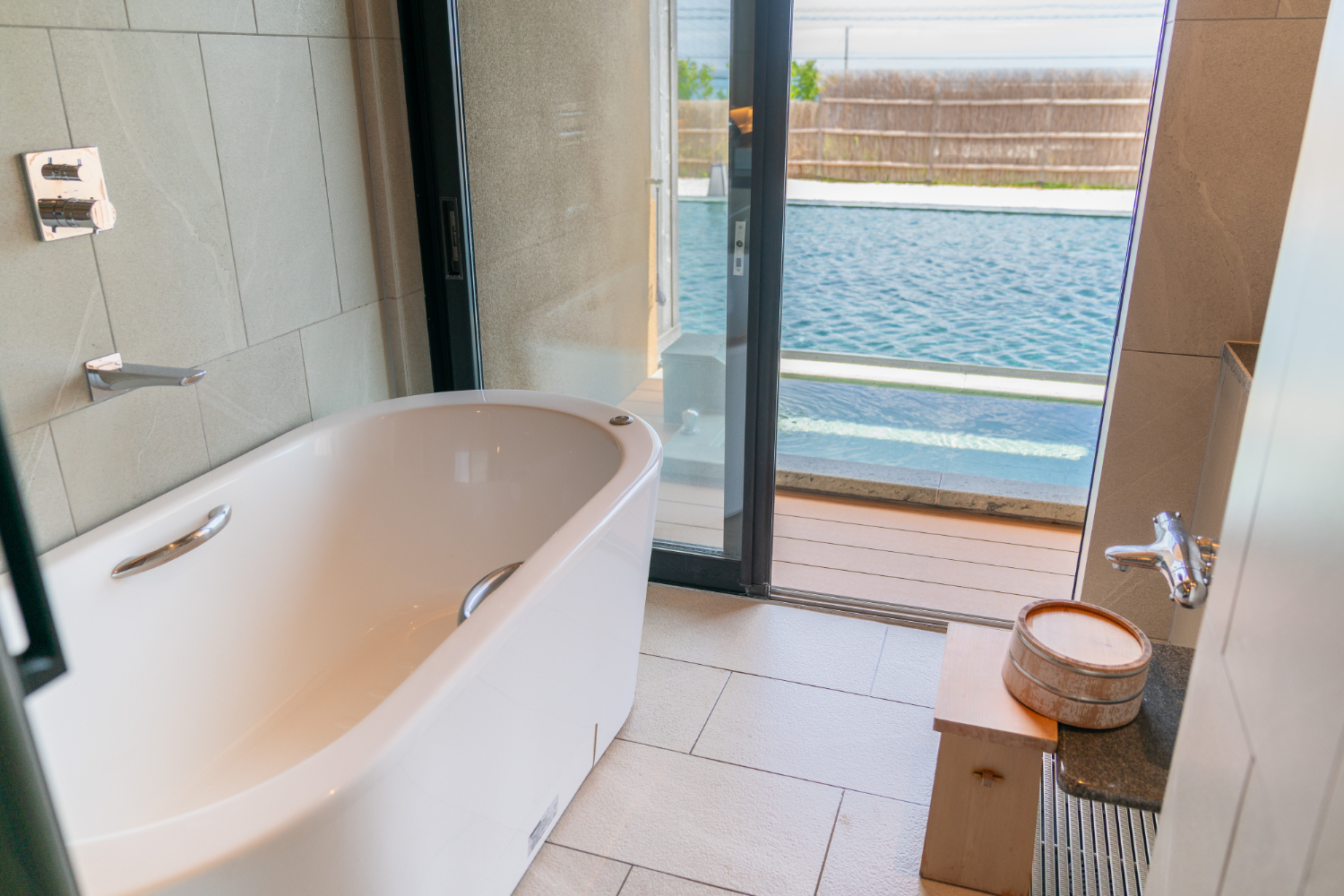 Q: Are the hot spring baths at Lien private? A: Yes, all rooms at Kamogawa Onsen Lien are equipped with both an indoor bath and a private, Japanese-style outdoor hot spring bath (rotenburo) overlooking the ocean.