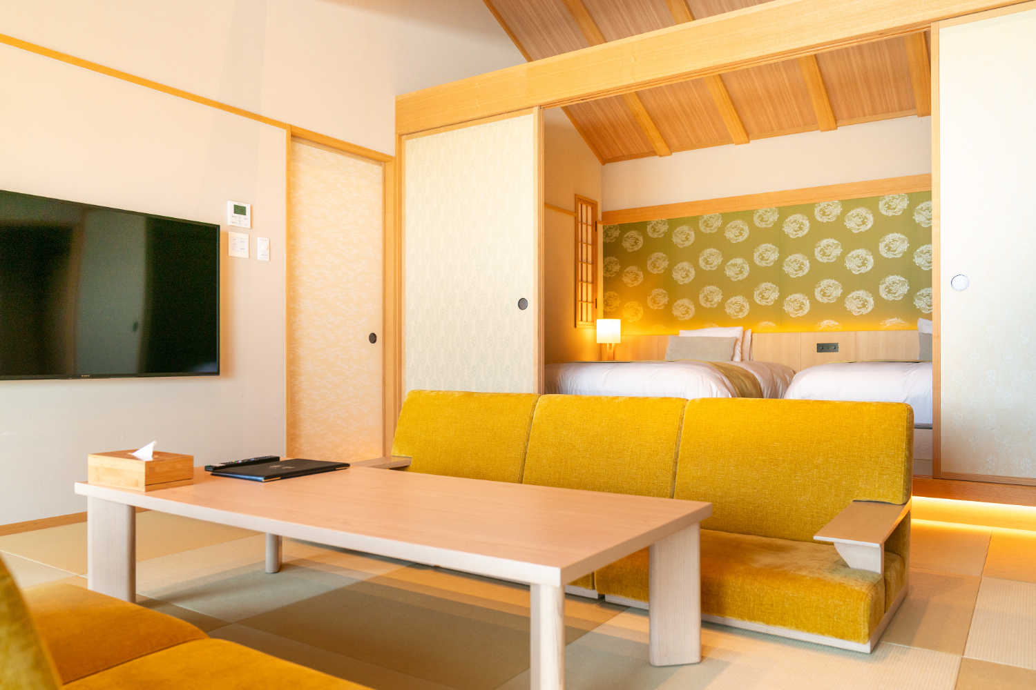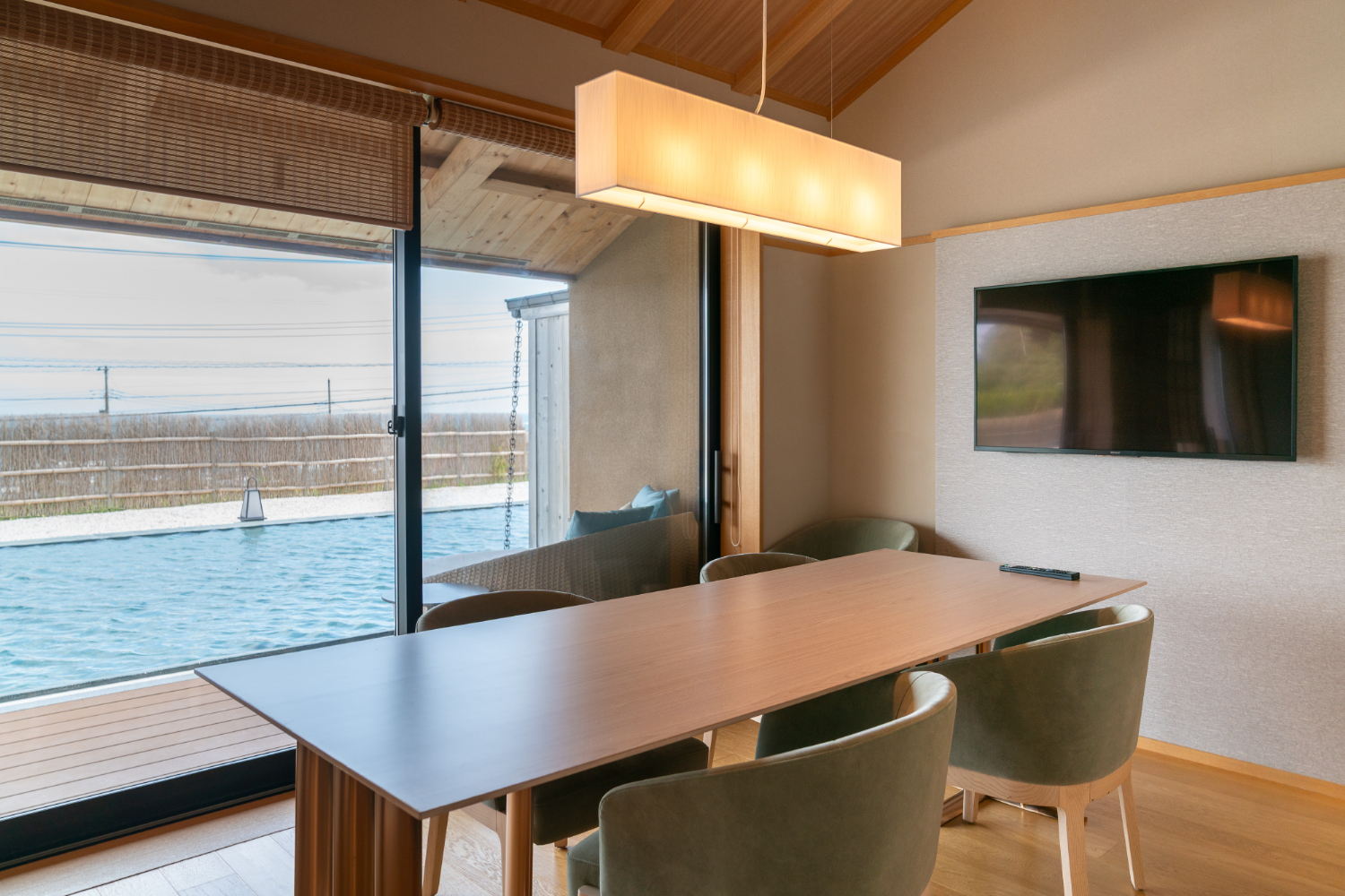 There are three types of rooms at Lien, each designed to be a world unto itself. The rooms consist of a large living space connected via a wide entrance to the main bedroom. The bathroom features an indoor bath as well as a Japanese-style outdoor hot spring bath, all tastefully designed with high-quality materials and finishes. Next to the living area in the ‘A’ type room is a dining room where guests can enjoy their meals in complete privacy.