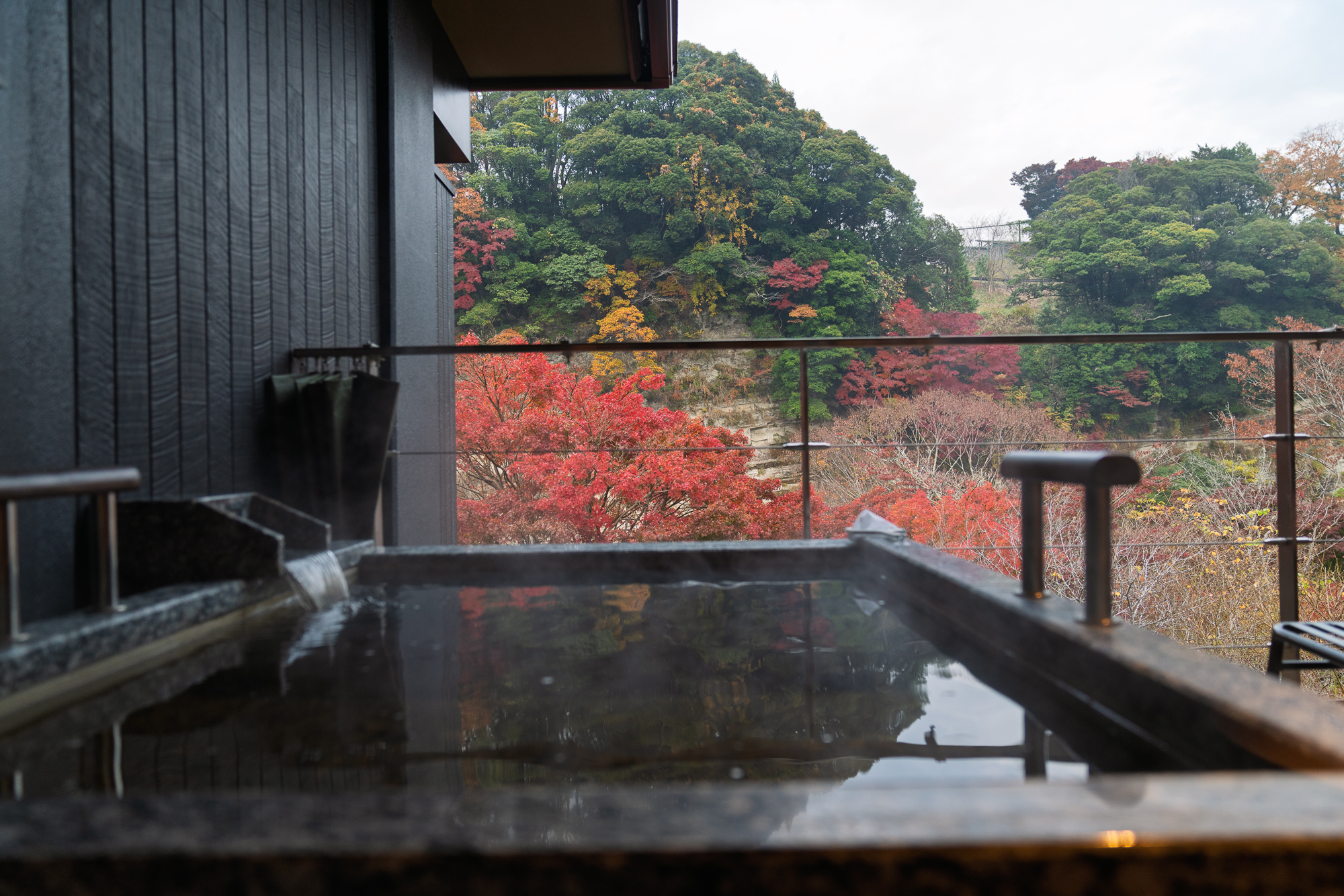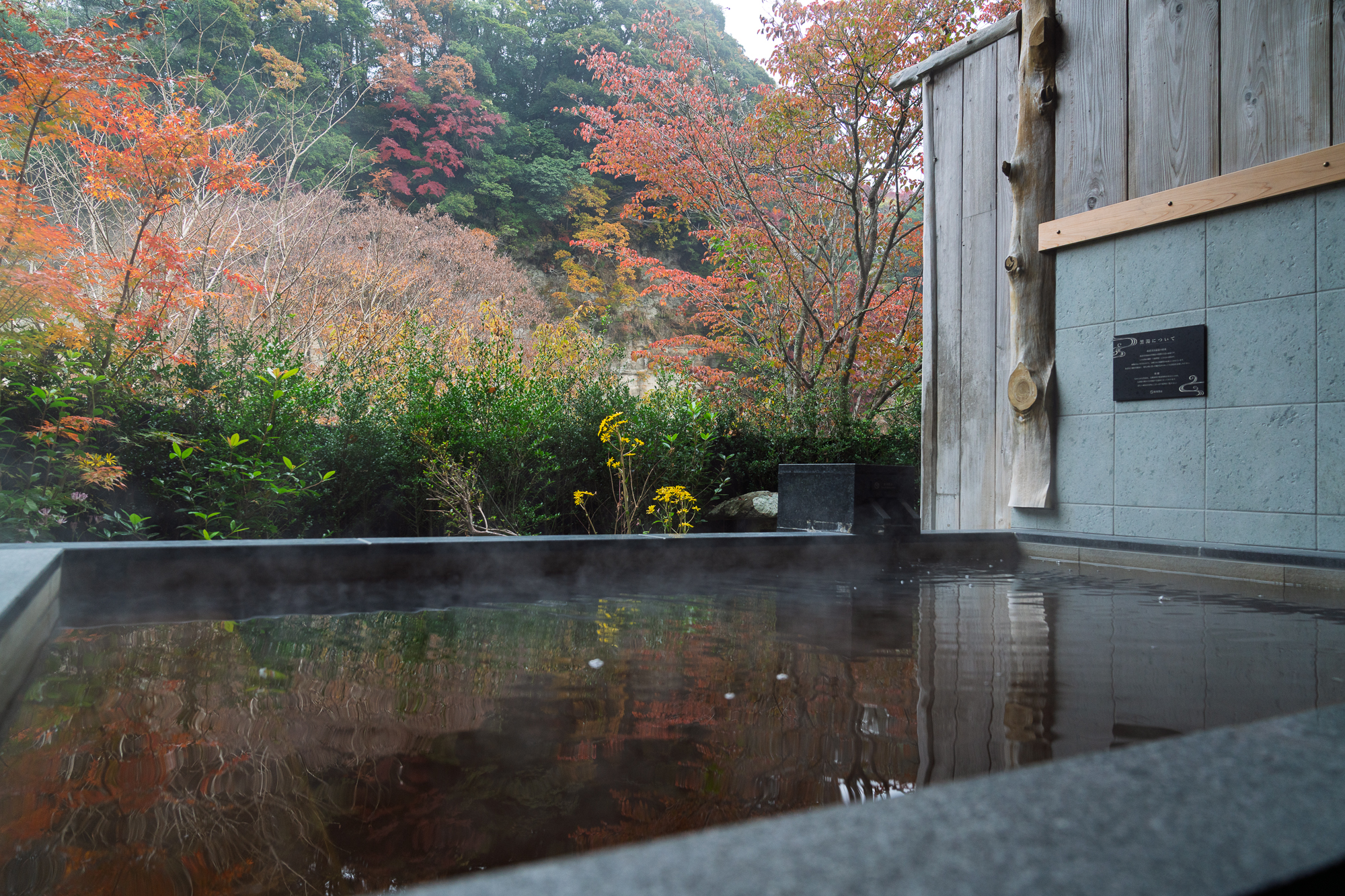 The water itself is known as kuroyu, black hot spring water known throughout the region for its skin-beautifying properties. This is the defining characteristic of the Yoro Valley hot springs, considered the finest onsen village in the Boso Peninsula.