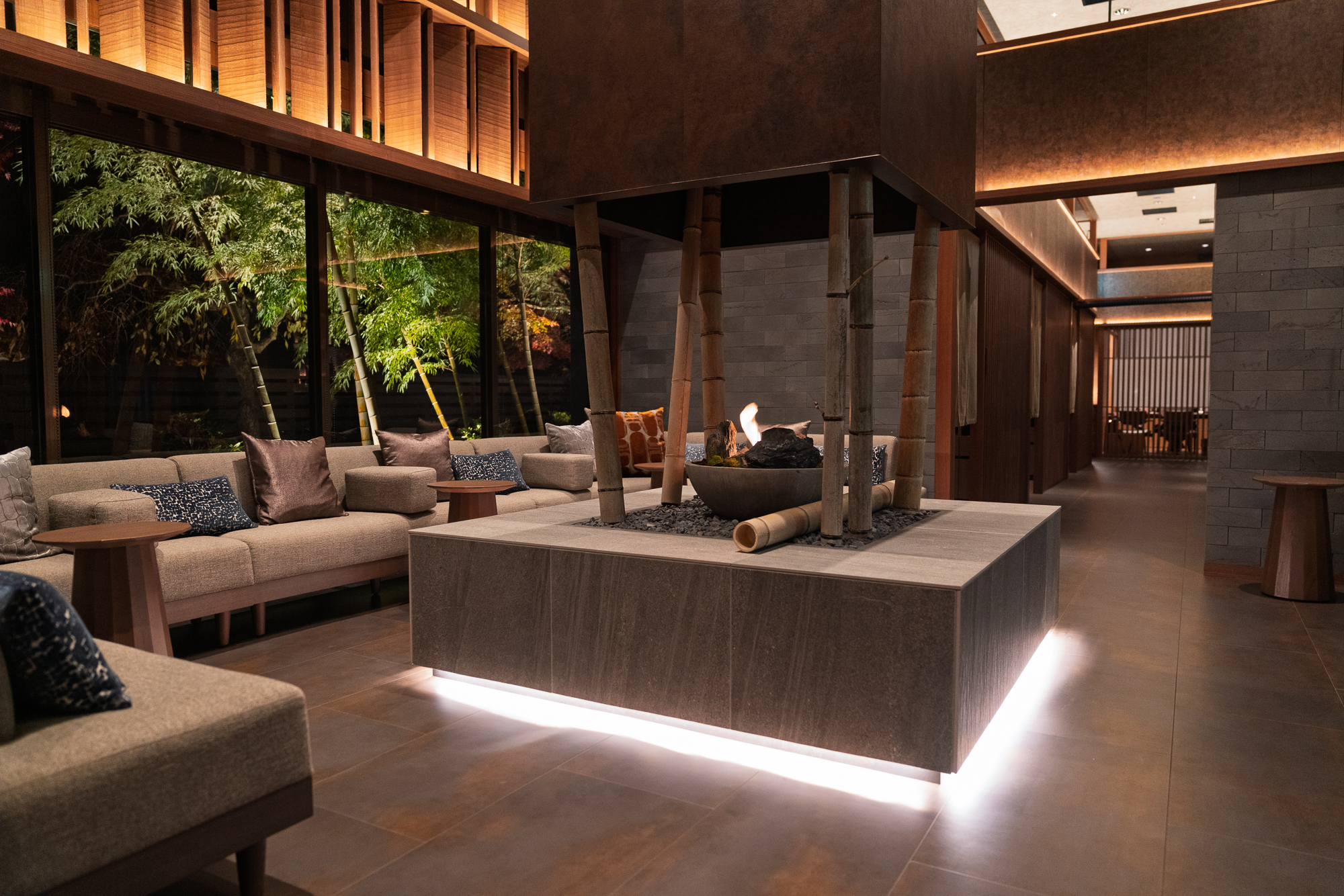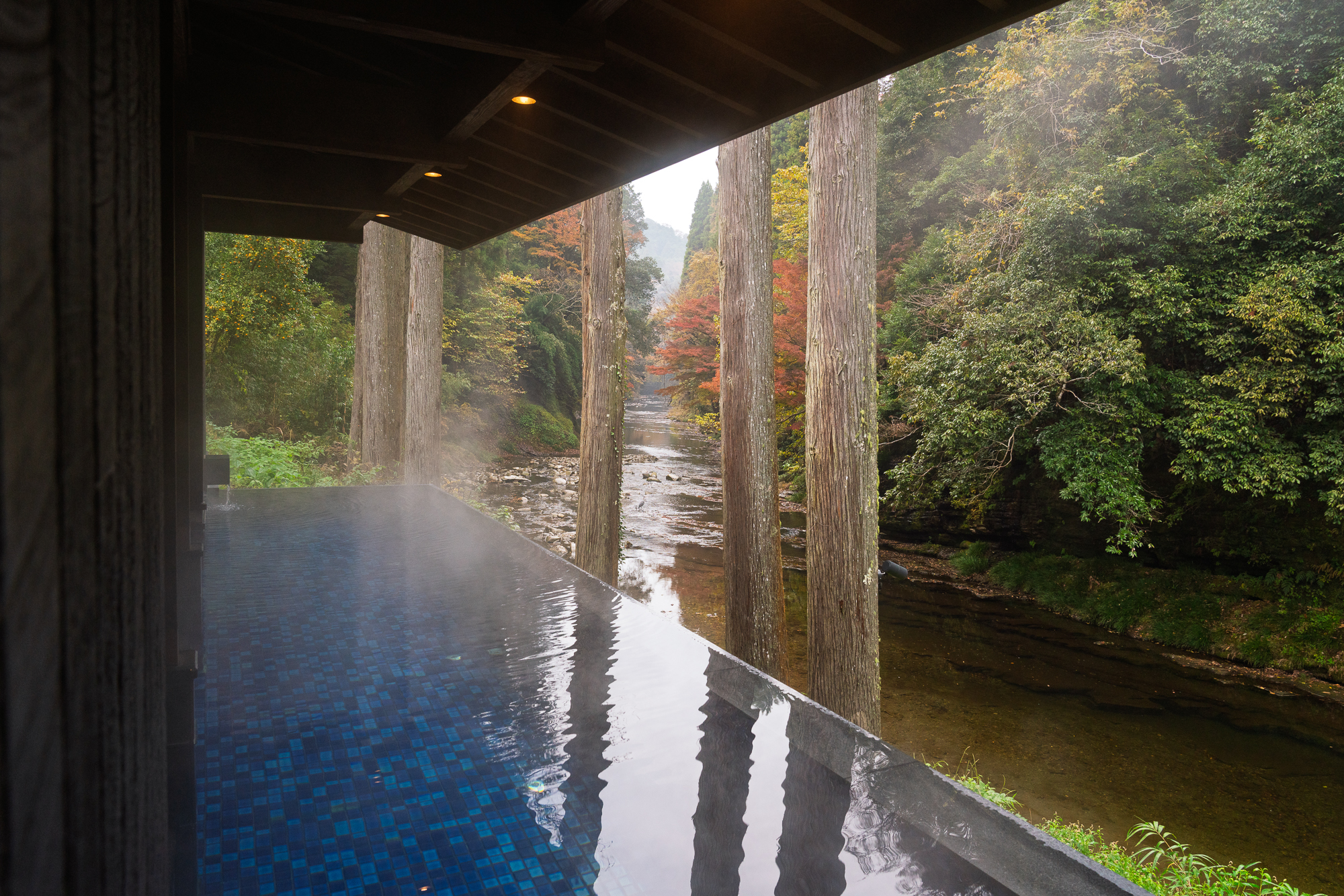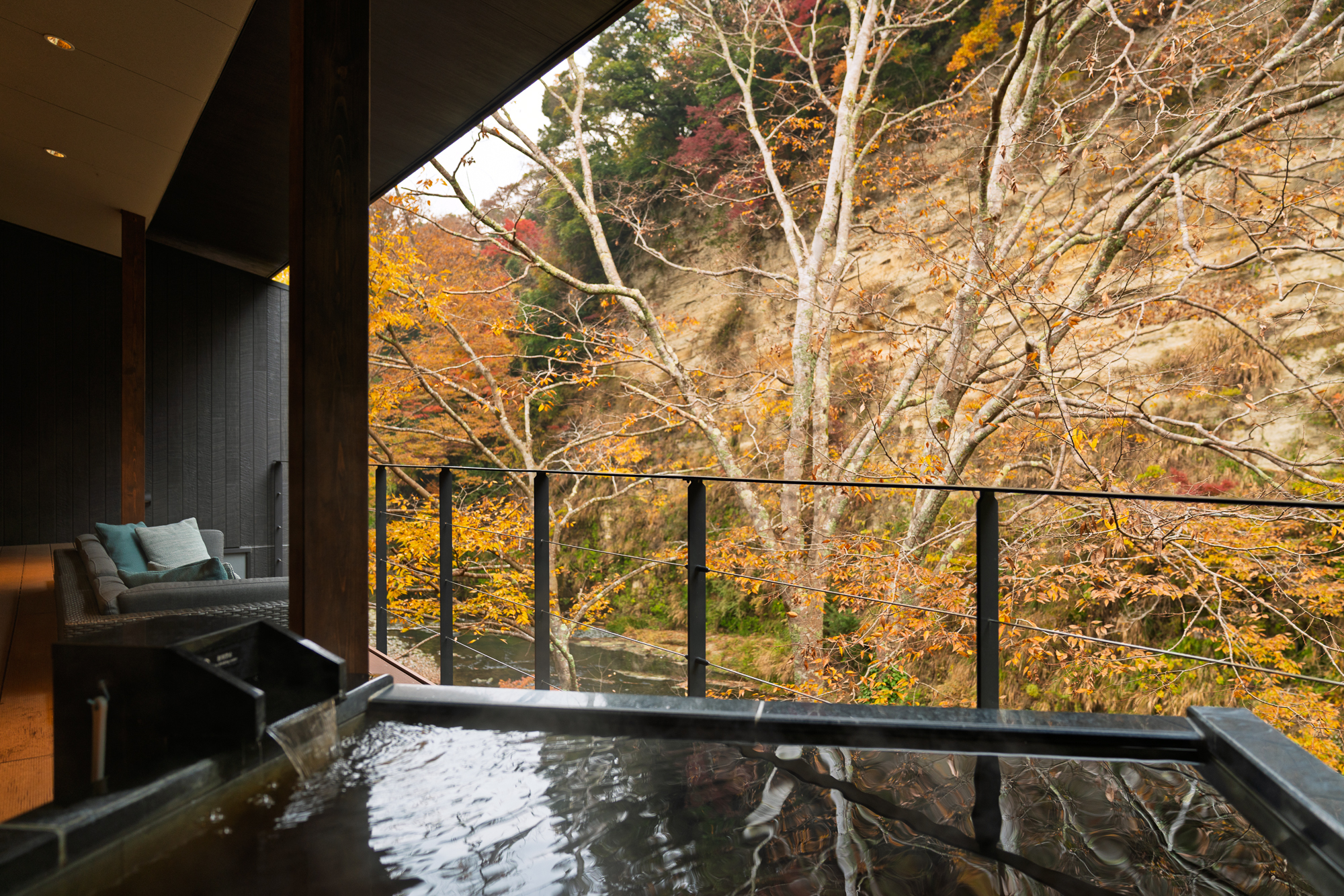 From the moment you arrive, the premium nature of the experience is clear. Check-in takes place in a lounge just inside the entrance, with gorgeous views out to the valley. The accommodation options range from standard valley-view rooms to the premium Riverscape rooms, six spacious suites that sit further down the hill and face directly onto the river. Each room features a private outdoor bath with water flowing twenty-four hours a day, so you can soak in the afternoon light, under the stars at night, or as the morning mist rises from the valley floor.
