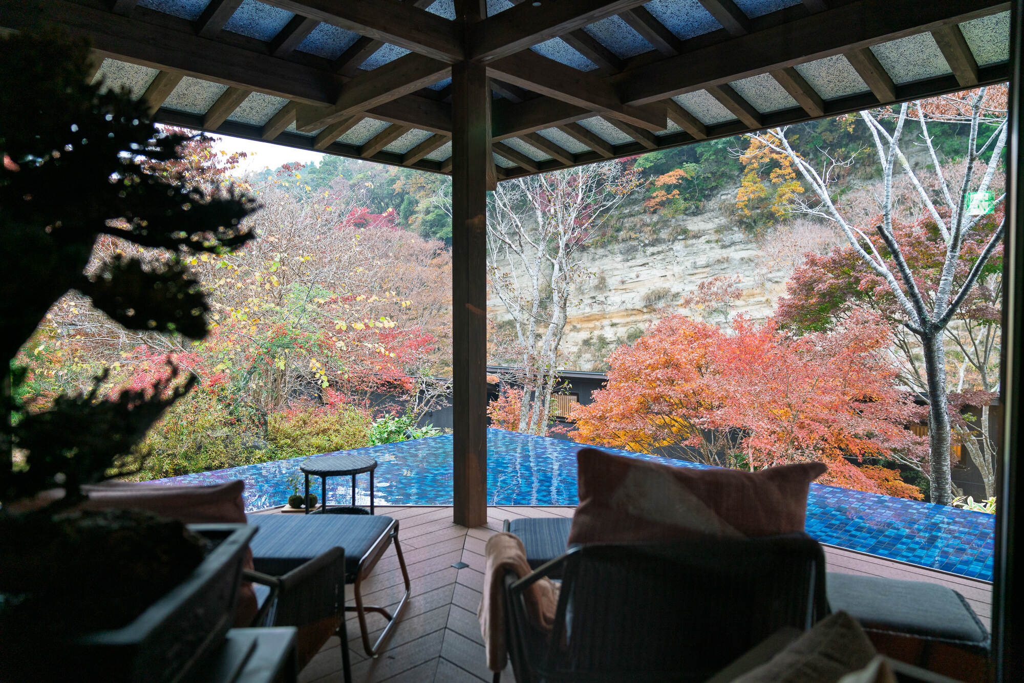 Shinra offers several bathing experiences beyond the private baths. The Fukasawa pool reimagines the traditional onsen as a mixed-bathing pool where guests wear swimsuits provided by Shinra to share the experience with companions while taking in views of the valley. For those seeking complete privacy, two private bathing areas can be reserved free of charge, and a rental sauna is available for ninety-minute sessions.