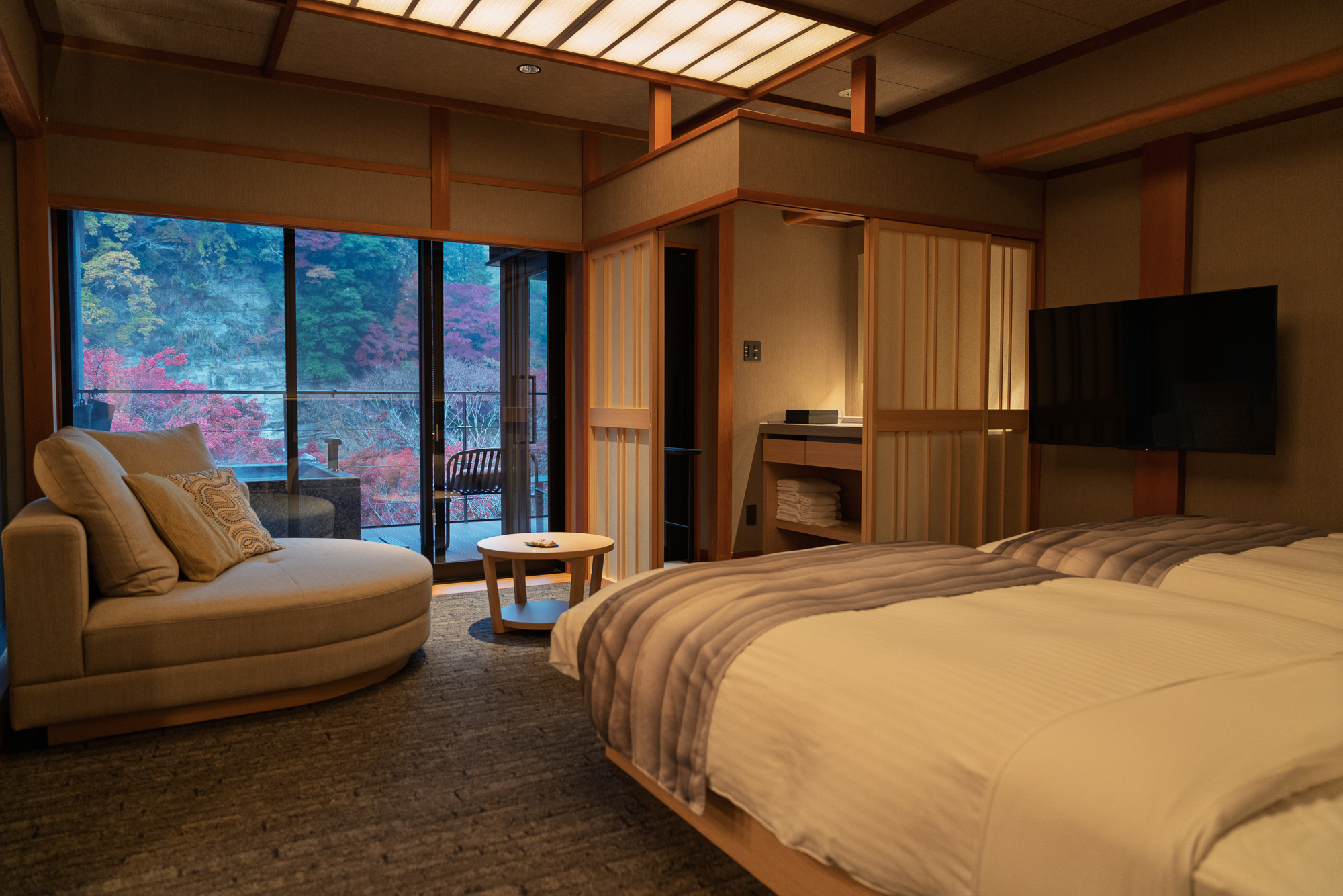 The resort maintains an adults-only policy, ensuring an atmosphere of tranquility. Shinra provides a shuttle bus service from Yorokeikoku Station, making the property accessible without a rental car, but having your own transportation opens up the valley’s other attractions including the famous Awamata-no-taki waterfall, considered one of the finest in the Boso region.