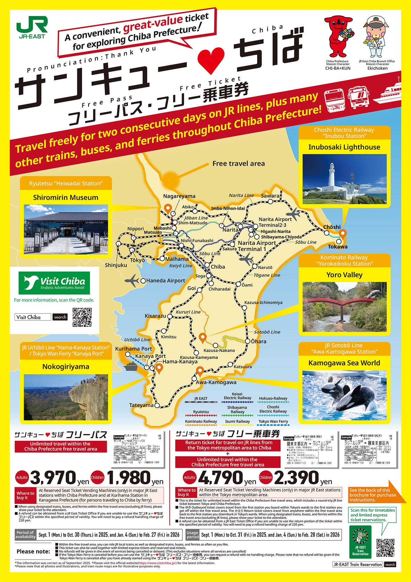 The “Chiba Thank You Free Pass” is a seasonal two-day ticket sold by JR East. With this pass, you can take unlimited rides on JR trains around Chiba — plus participating private railways and buses, and even a ferry — for two consecutive days. The next period this pass will be available is from January 4, 2026 to February 28, 2026 (last day of purchase: February 27, 2026).