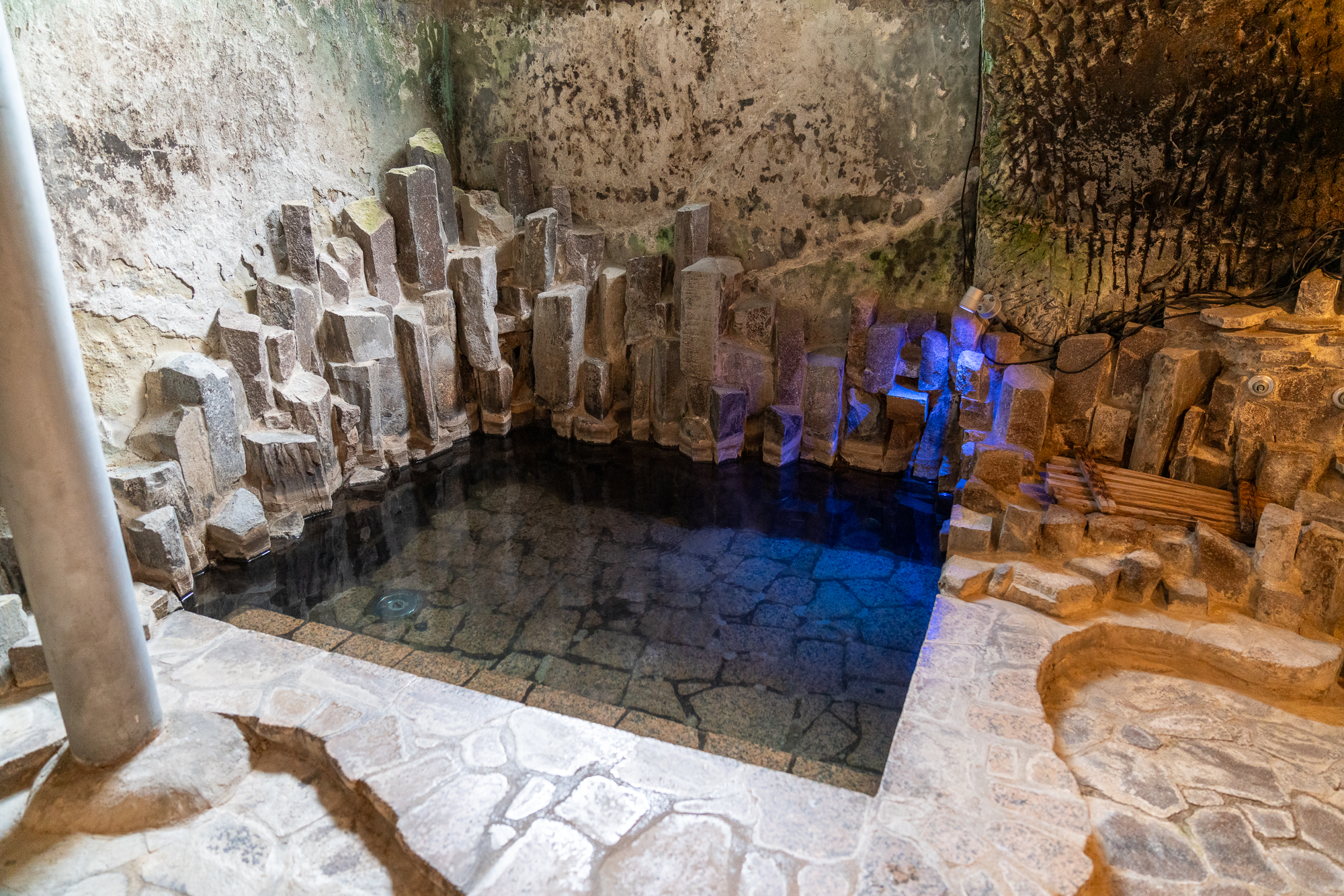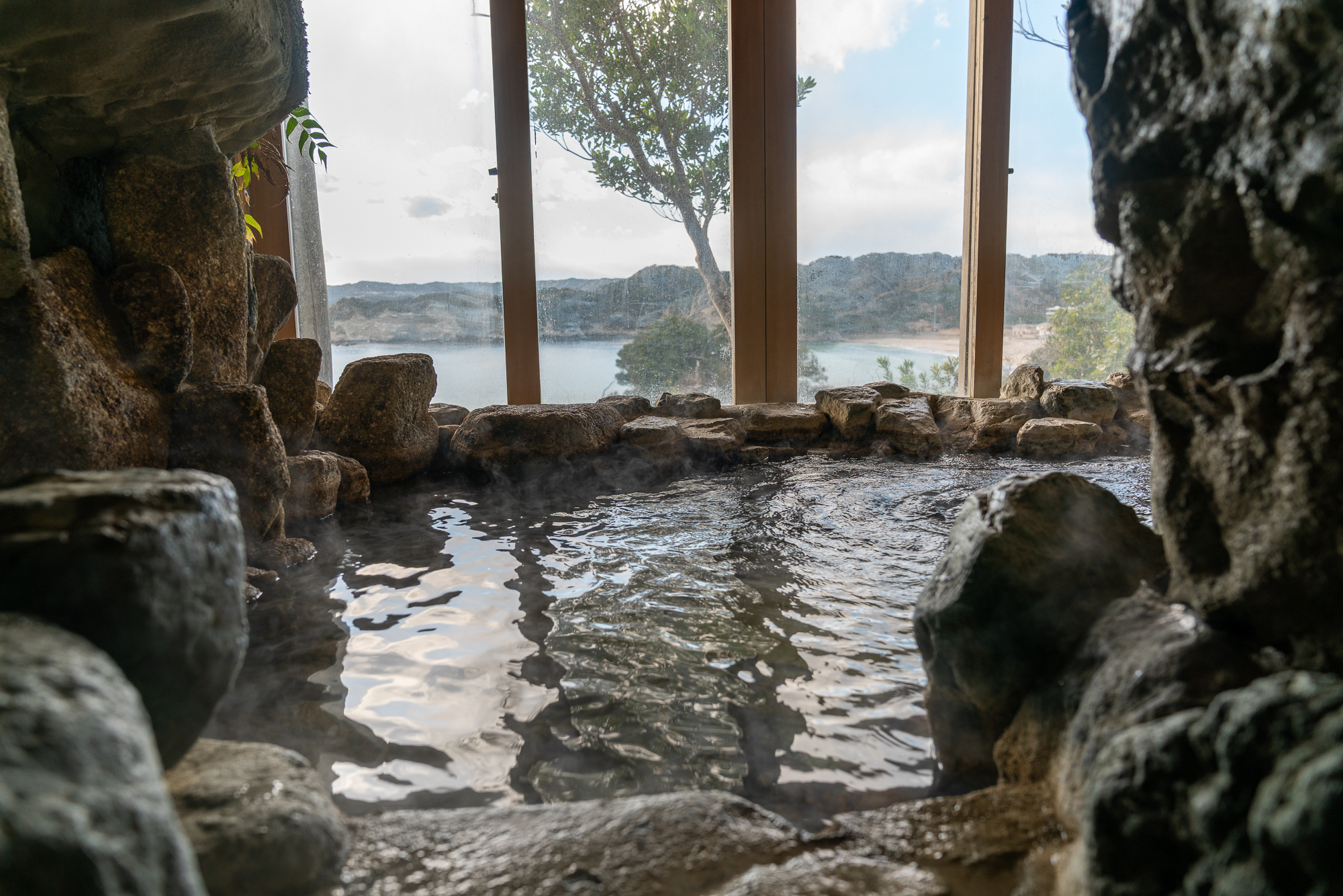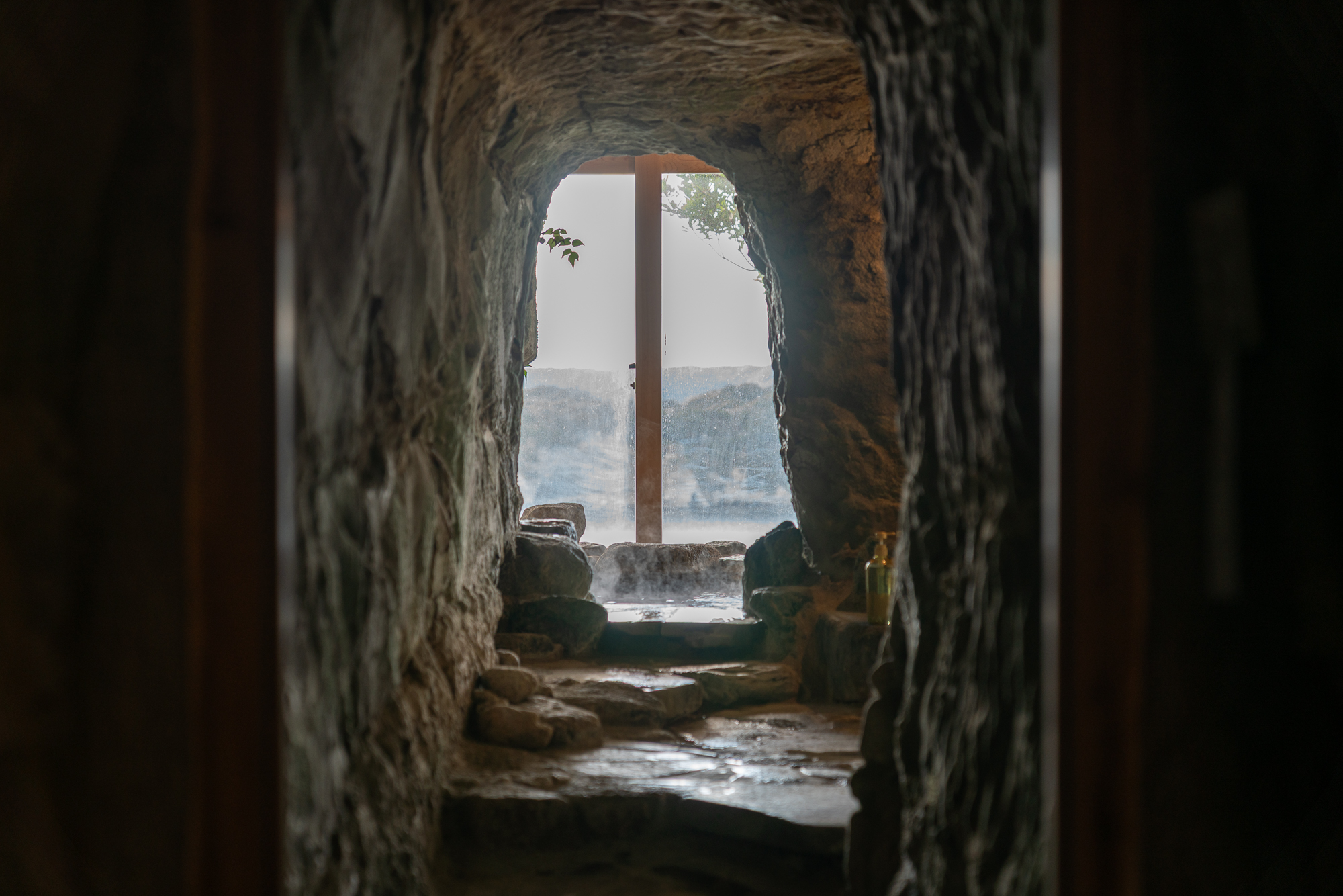 The three baths remain Ubarakan’s most unusual feature, with natural hot spring water filling each one. The tunnel bath, carved directly through the rock face, creates an otherworldly bathing experience, while the cave bath offers a more intimate atmosphere. The observation bath looks out over the Pacific, with the horizon stretching uninterrupted to the east. Each bath offers a different way to experience hot spring water in combination with the rugged coastal landscape.